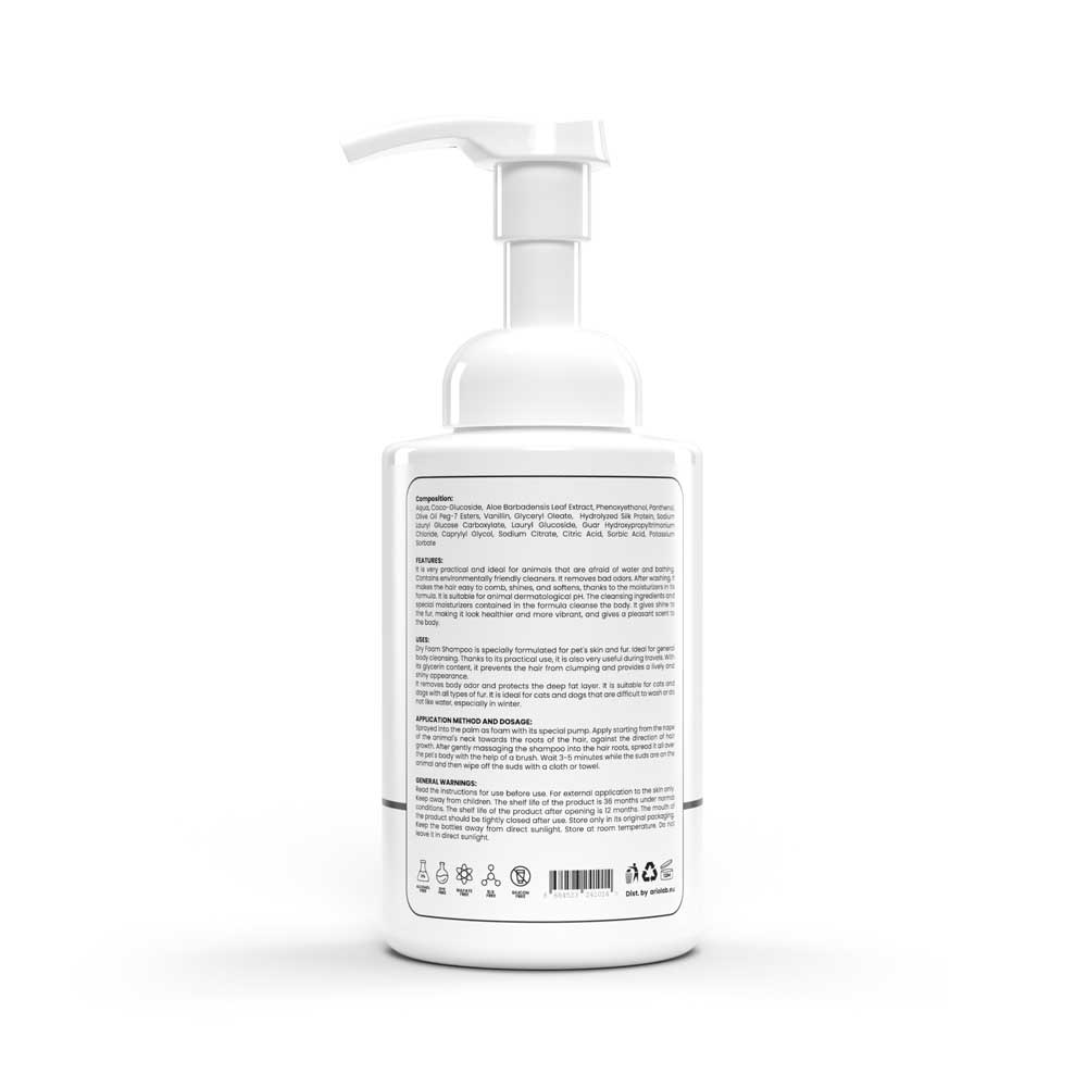 Dry Foam Shampoo is specially formulated for pet’s skin and fur. Ideal for general body cleansing. Thanks to its practical use, it is also very useful during travels. With its glycerin content, it prevents the hair from clumping and provides a lively and shiny appearance.